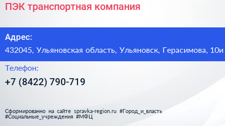 ПЭК, транспортная компания по адресу 432045, Ульяновская область, Ульяновск, Герасимова, 10и в дальнейшем Организация, размещена в следующих категориях: