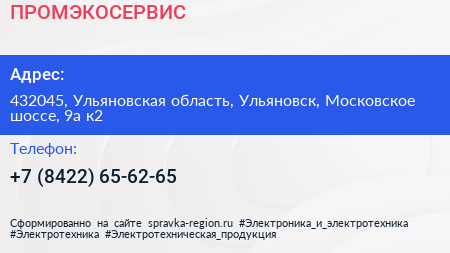 ПРОМЭКОСЕРВИС по адресу 432045, Ульяновская область, Ульяновск, Московское шоссе, 9а к2 в дальнейшем Организация, размещена в следующих категориях: