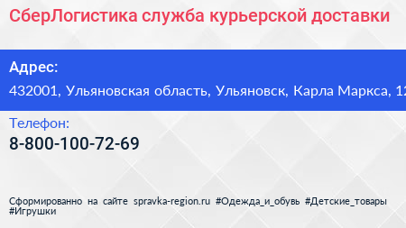 СберЛогистика, служба курьерской доставки по адресу 432001, Ульяновская область, Ульяновск, Карла Маркса, 12 в дальнейшем Организация, размещена в следующих категориях: