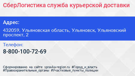 СберЛогистика, служба курьерской доставки по адресу 432059, Ульяновская область, Ульяновск, Ульяновский проспект, 2 в дальнейшем Организация, размещена в следующих категориях: