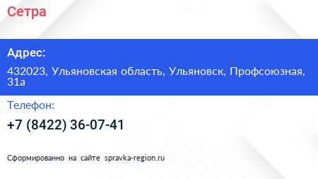 Сетра по адресу 432023, Ульяновская область, Ульяновск, Профсоюзная, 31а в дальнейшем Организация, размещена в следующих категориях: