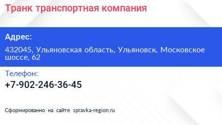 Транк, транспортная компания по адресу 432045, Ульяновская область, Ульяновск, Московское шоссе, 62 в дальнейшем Организация, размещена в следующих категориях: