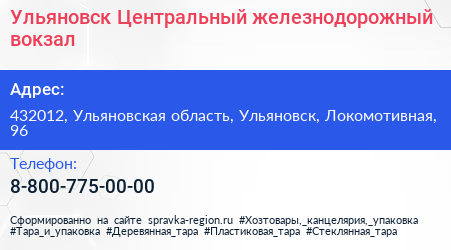 Ульяновск-Центральный, железнодорожный вокзал по адресу 432012, Ульяновская область, Ульяновск, Локомотивная, 96 в дальнейшем Организация, размещена в следующих категориях: