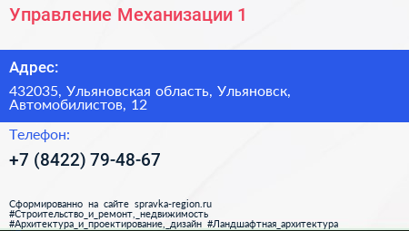 Управление Механизации №1 по адресу 432035, Ульяновская область, Ульяновск, Автомобилистов, 12 в дальнейшем Организация, размещена в следующих категориях: