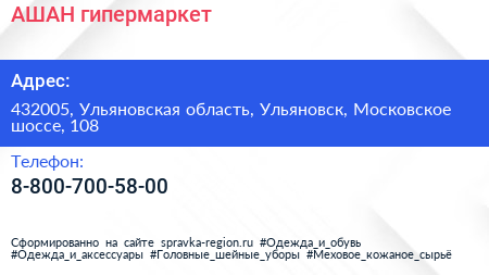 АШАН, гипермаркет по адресу 432005, Ульяновская область, Ульяновск, Московское шоссе, 108 в дальнейшем Организация, размещена в следующих категориях:
