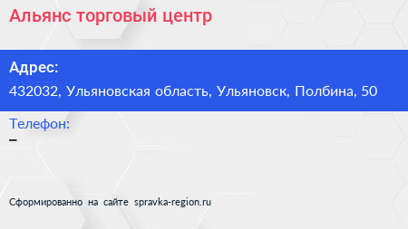 Альянс, торговый центр по адресу 432032, Ульяновская область, Ульяновск, Полбина, 50 в дальнейшем Организация, размещена в следующих категориях: