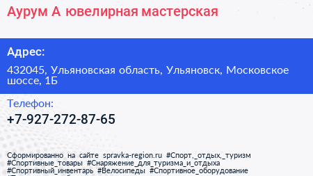 Аурум-А, ювелирная мастерская по адресу 432045, Ульяновская область, Ульяновск, Московское шоссе, 1Б в дальнейшем Организация, размещена в следующих категориях: