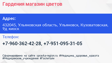 Гардения, магазин цветов по адресу 432045, Ульяновская область, Ульяновск, Кузоватовская, 9д киоск в дальнейшем Организация, размещена в следующих категориях: