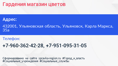 Гардения, магазин цветов по адресу 432001, Ульяновская область, Ульяновск, Карла Маркса, 35а в дальнейшем Организация, размещена в следующих категориях: