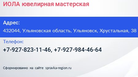 ИОЛА, ювелирная мастерская по адресу 432044, Ульяновская область, Ульяновск, Хрустальная, 38 в дальнейшем Организация, размещена в следующих категориях: