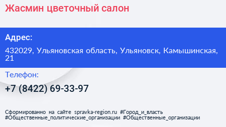 Жасмин, цветочный салон по адресу 432029, Ульяновская область, Ульяновск, Камышинская, 21 в дальнейшем Организация, размещена в следующих категориях: