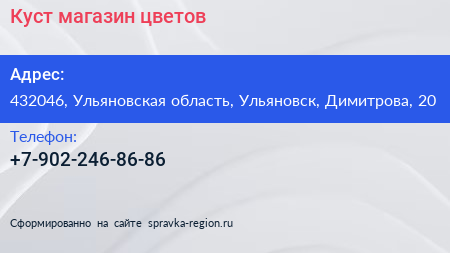Куст, магазин цветов по адресу 432046, Ульяновская область, Ульяновск, Димитрова, 20 в дальнейшем Организация, размещена в следующих категориях: