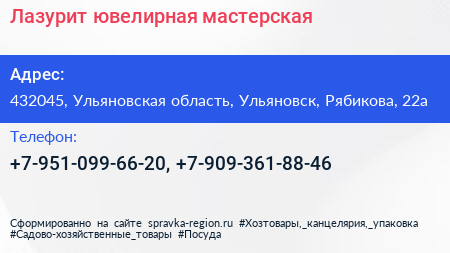 Лазурит, ювелирная мастерская по адресу 432045, Ульяновская область, Ульяновск, Рябикова, 22а в дальнейшем Организация, размещена в следующих категориях:
