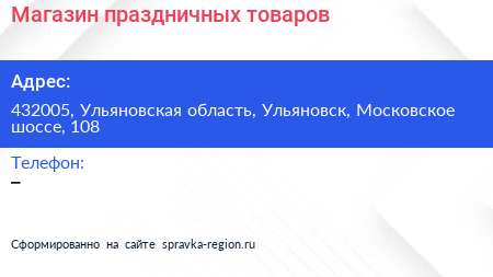 Магазин праздничных товаров по адресу 432005, Ульяновская область, Ульяновск, Московское шоссе, 108 в дальнейшем Организация, размещена в следующих категориях: