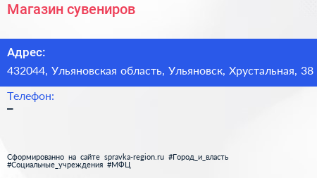 Магазин сувениров по адресу 432044, Ульяновская область, Ульяновск, Хрустальная, 38 в дальнейшем Организация, размещена в следующих категориях: