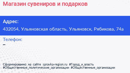 Магазин сувениров и подарков по адресу 432054, Ульяновская область, Ульяновск, Рябикова, 74а в дальнейшем Организация, размещена в следующих категориях: