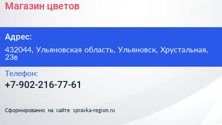Магазин цветов по адресу 432044, Ульяновская область, Ульяновск, Хрустальная, 23в в дальнейшем Организация, размещена в следующих категориях: