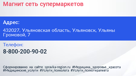 Магнит, сеть супермаркетов по адресу 432027, Ульяновская область, Ульяновск, Ульяны Громовой, 7 в дальнейшем Организация, размещена в следующих категориях: