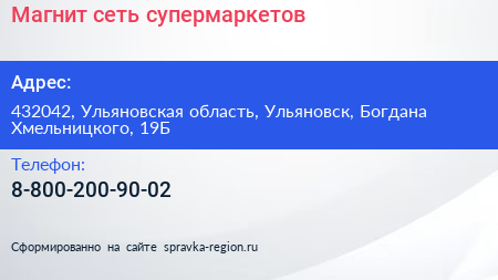 Магнит, сеть супермаркетов по адресу 432042, Ульяновская область, Ульяновск, Богдана Хмельницкого, 19Б в дальнейшем Организация, размещена в следующих категориях: