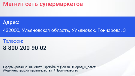Магнит, сеть супермаркетов по адресу 432000, Ульяновская область, Ульяновск, Гончарова, 3 в дальнейшем Организация, размещена в следующих категориях: