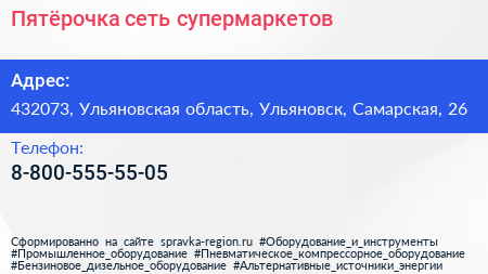 Пятёрочка, сеть супермаркетов по адресу 432073, Ульяновская область, Ульяновск, Самарская, 26 в дальнейшем Организация, размещена в следующих категориях: