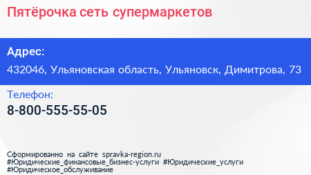 Пятёрочка, сеть супермаркетов по адресу 432046, Ульяновская область, Ульяновск, Димитрова, 73 в дальнейшем Организация, размещена в следующих категориях: