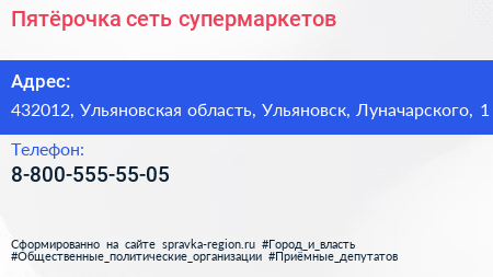 Пятёрочка, сеть супермаркетов по адресу 432012, Ульяновская область, Ульяновск, Луначарского, 1 в дальнейшем Организация, размещена в следующих категориях: