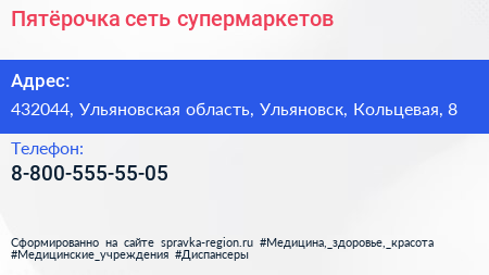 Пятёрочка, сеть супермаркетов по адресу 432044, Ульяновская область, Ульяновск, Кольцевая, 8 в дальнейшем Организация, размещена в следующих категориях: