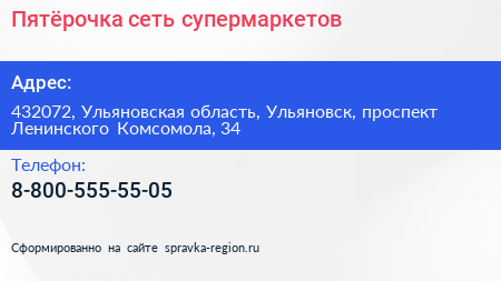 Пятёрочка, сеть супермаркетов по адресу 432072, Ульяновская область, Ульяновск, проспект Ленинского Комсомола, 34 в дальнейшем Организация, размещена в следующих категориях: