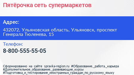 Пятёрочка, сеть супермаркетов по адресу 432072, Ульяновская область, Ульяновск, проспект Генерала Тюленева, 15 в дальнейшем Организация, размещена в следующих категориях:
