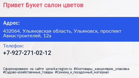 Привет Букет, салон цветов по адресу 432064, Ульяновская область, Ульяновск, проспект Авиастроителей, 12а в дальнейшем Организация, размещена в следующих категориях:
