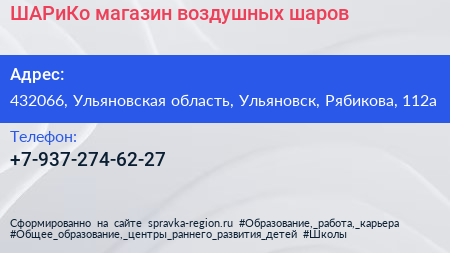ШАРиКо, магазин воздушных шаров по адресу 432066, Ульяновская область, Ульяновск, Рябикова, 112а в дальнейшем Организация, размещена в следующих категориях: