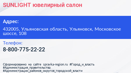 SUNLIGHT, ювелирный салон по адресу 432005, Ульяновская область, Ульяновск, Московское шоссе, 108 в дальнейшем Организация, размещена в следующих категориях:
