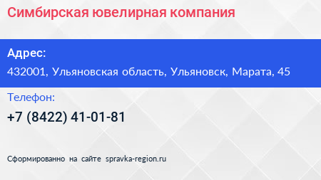 Симбирская ювелирная компания по адресу 432001, Ульяновская область, Ульяновск, Марата, 45 в дальнейшем Организация, размещена в следующих категориях: