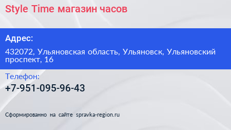 Style Time, магазин часов по адресу 432072, Ульяновская область, Ульяновск, Ульяновский проспект, 16 в дальнейшем Организация, размещена в следующих категориях: