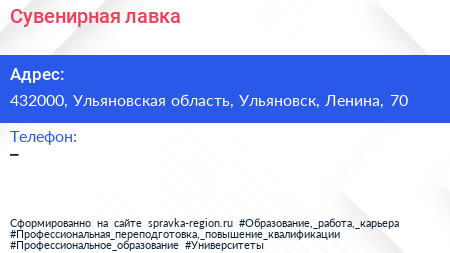 Сувенирная лавка по адресу 432000, Ульяновская область, Ульяновск, Ленина, 70 в дальнейшем Организация, размещена в следующих категориях:
