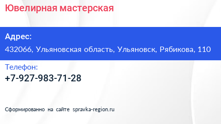 Ювелирная мастерская по адресу 432066, Ульяновская область, Ульяновск, Рябикова, 110 в дальнейшем Организация, размещена в следующих категориях: