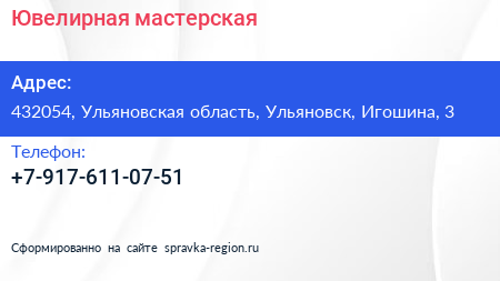 Ювелирная мастерская по адресу 432054, Ульяновская область, Ульяновск, Игошина, 3 в дальнейшем Организация, размещена в следующих категориях: