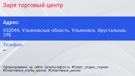 Заря, торговый центр по адресу 432044, Ульяновская область, Ульяновск, Хрустальная, 19Б в дальнейшем Организация, размещена в следующих категориях: