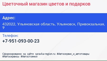 Цветочный, магазин цветов и подарков по адресу 432022, Ульяновская область, Ульяновск, Привокзальная, 9 в дальнейшем Организация, размещена в следующих категориях: