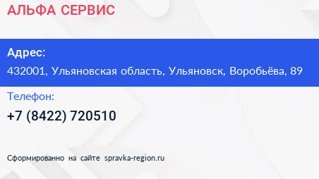 АЛЬФА СЕРВИС по адресу 432001, Ульяновская область, Ульяновск, Воробьёва, 89 в дальнейшем Организация, размещена в следующих категориях:
