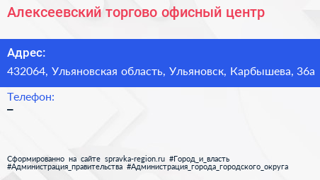 Алексеевский, торгово-офисный центр по адресу 432064, Ульяновская область, Ульяновск, Карбышева, 36а в дальнейшем Организация, размещена в следующих категориях: