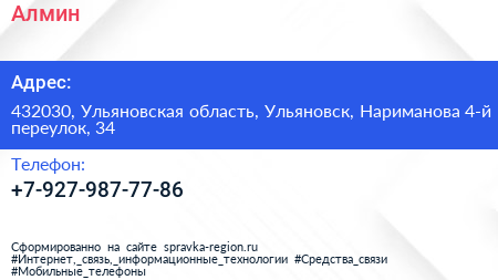 Алмин по адресу 432030, Ульяновская область, Ульяновск, Нариманова 4-й переулок, 34 в дальнейшем Организация, размещена в следующих категориях: