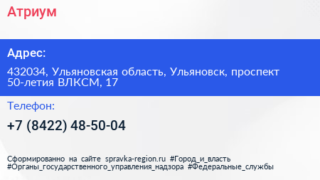 Атриум по адресу 432034, Ульяновская область, Ульяновск, проспект 50-летия ВЛКСМ, 17 в дальнейшем Организация, размещена в следующих категориях: