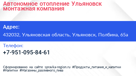 Автономное отопление Ульяновск, монтажная компания по адресу 432032, Ульяновская область, Ульяновск, Полбина, 65а в дальнейшем Организация, размещена в следующих категориях: