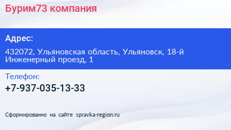Бурим73, компания по адресу 432072, Ульяновская область, Ульяновск, 18-й Инженерный проезд, 1 в дальнейшем Организация, размещена в следующих категориях: