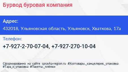 Бурвод, буровая компания по адресу 432018, Ульяновская область, Ульяновск, Хваткова, 17а в дальнейшем Организация, размещена в следующих категориях: