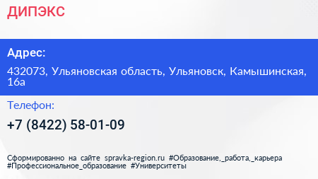 ДИПЭКС по адресу 432073, Ульяновская область, Ульяновск, Камышинская, 16а в дальнейшем Организация, размещена в следующих категориях: