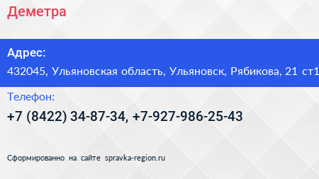 Деметра по адресу 432045, Ульяновская область, Ульяновск, Рябикова, 21 ст1 в дальнейшем Организация, размещена в следующих категориях:
