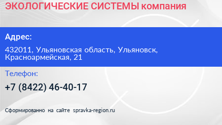 ЭКОЛОГИЧЕСКИЕ СИСТЕМЫ, компания по адресу 432011, Ульяновская область, Ульяновск, Красноармейская, 21 в дальнейшем Организация, размещена в следующих категориях: